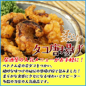 商品 柔らかタコの唐揚げ500g 原材料:たこ、食塩、衣(コーンスターチ、小麦粉、食塩、脱脂粉乳、でん粉、卵白粉末、デキストリン、砂糖、ぶどう糖、香辛料)、加工でん粉、調味料(アミノ酸等)、pH調整剤、香辛料抽出物、パプリカ色素 原産国:ベトナム 保存方法:-18℃以下で保存 内容量:500g×1パック 賞味期限:商品に業務用冷凍庫保管での賞味期限が記載されますが、ご家庭用冷凍庫での保管は1ヶ月を推奨しております。