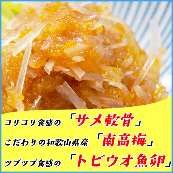 コリコリしたサメ軟骨と、プチっとした飛魚卵の食感を、南高梅のさっぱりとした風味でお楽しみください。